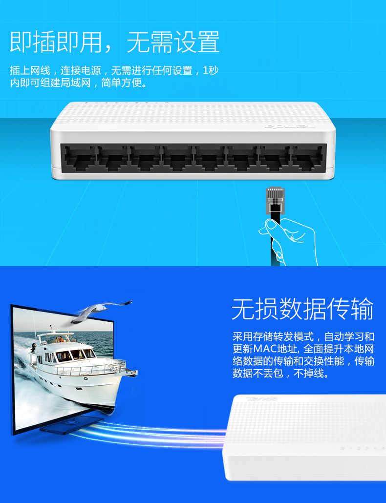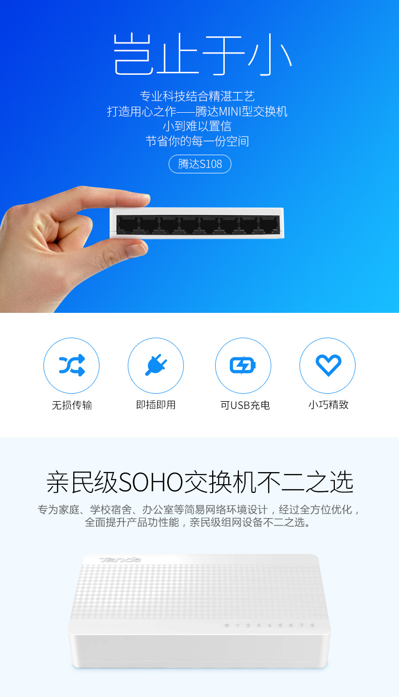 騰達交換機(jī)8口百兆 校(xiào)園宿舍網線分(fēn)線器USB供電S108